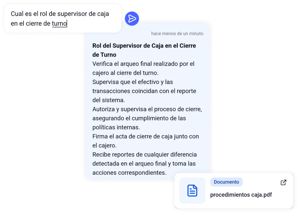 Una IA entrenada con manuales, protocolos y capacitaciones. Responde dudas en segundos 24/7 y guía a los equipos desde el primer día.