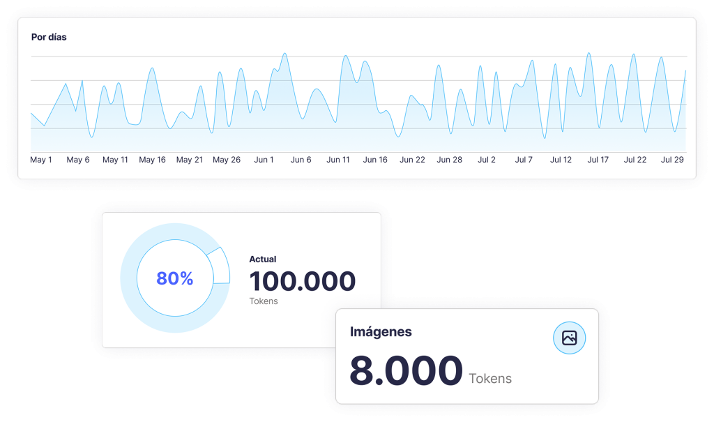 Consulta gráficas detalladas del consumo por tipo de consulta, documento, audio o imagen, y haz seguimiento del uso diario de tokens por equipo o usuario.